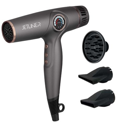 Stylecraft and Silver Bullet introduce the JetLiner cutting-edge long life digital brushless motor hair dryer, a game-changing tool that will revolutionize your hairstyling experience. Operating at an incredible 105,000 RPM, this motor delivers powerful and efficient performance, ensuring quick drying and styling. The digital display features 5 preset heat/speed settings designed specifically for fine, normal, and coarse hair, with a turbo mode for rapid drying and a manual mode for customized performance. With a total of 13 heat/speed settings available in manual mode, you can find the perfect temperature and airflow for every hair type. Experience salon-quality results with our Ionic Generator technology. This advanced feature seals the hair cuticle, creating a smooth and shiny finish while reducing frizz. Say goodbye to unruly hair and hello to a sleek and polished look that lasts. The professional 9 ft cord provides ample reach and flexibility during use, and the convenient hanging hook ensures easy storage when you're done. The auto-locking function ensures that your selected speed and heat settings remain consistent throughout your styling session, eliminating the frustration of accidental adjustments.